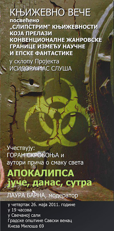 O antologiji će govoriti priređivač Goran Skrobonja i prisutni autori proznih dela zastupljenih u knjizi, dok će članovi "Šok koridora" predstaviti neka od najvažnijih kinematografskih ostvarenja koja obrađuju temu apokalipse..."