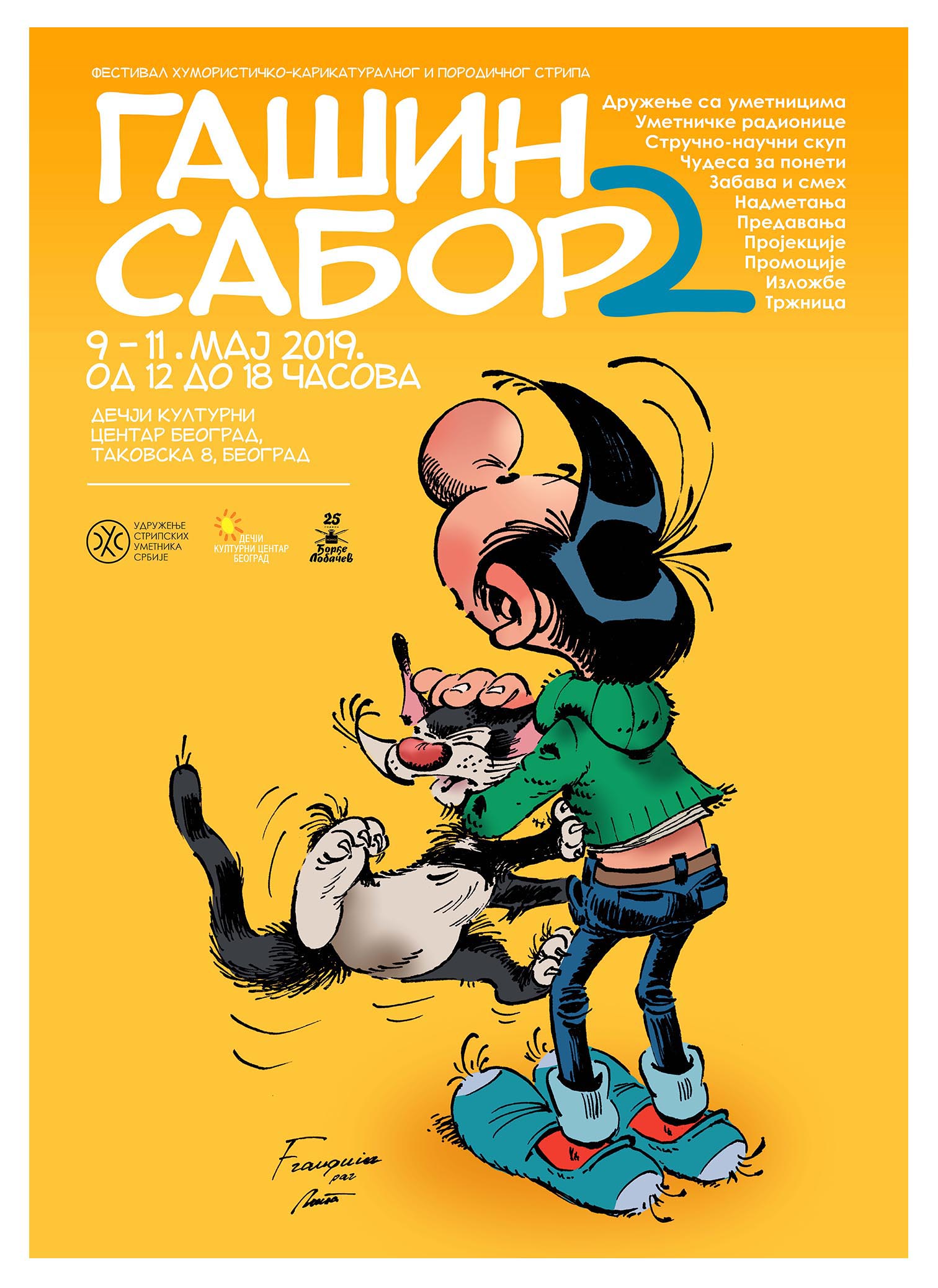 Публици свих генерација се нуди осам изванредних изложби: четири од Франкена, затим главног госта Радича Мијатовића – Мише, Лазе Средановића и других српских и франко-белгијских аутора. Организоване су специјалне вођене туре по изложбама за школе, понуда најновијих и класичних издања стрипова, промоције књига и предавања, пројекција новог филма ,,Гаша Шепртља", као и ликовне радионице за децу и одрасле у организацији Школе ,,Ђорђе Лобачев".
