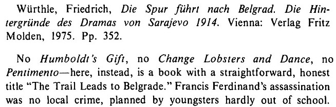 nastavlja se citanje najizuzetnije analize sarajevskog atentata, sve iz pera istrazivaca koji svjetski autoritet broj 1 iz te oblasti. jos sam imao srece da dobijem knjigu sa posvetom kolegi znanstveniku koji ubacio i eratu. vrlo temeljan rad, a ne postoji arhiva u koju würthle nije imao uvid, od austrijskih, pa sve do zarobljenih beogradskih, onih iz najdubljih ponora gdje se inace krije istina.
