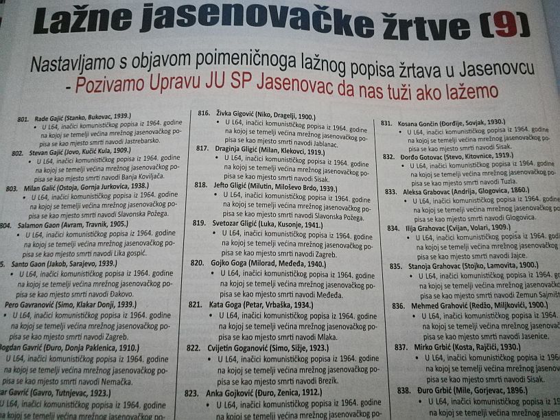 7) Potpuni krah popisa JUSP Jasenovac donijela su istraživanja vrhunskih informatičara Nikole Banića i Mladena Koića objavljena u više od 60 članaka (svi na portalu ,,Narod"). Najprije su otkrili oko 14.000 (i višestruko) ponovljenih imena, a kad je JUSP Jasenovac to ,,ispravio" otkrili su da su imena za doknadu višestrukih JUSP-ovci uzeli s jugoslavenskog popisa na kojemu je navedeno da su ti ljudi stradali drugdje (a oni mjesto stradanja promijenili u Jasenovac). Najimpresivniji nalaz Banića i Koića došao je iz njihove analize godina rođenja navedenih uz imena žrtava. Primjerice, broj žrtava koje su navodno bile rođene 1900. dvostruko je veći nego onih rođenih 1899. ili 1901. To je izravan i nepobitan matematički dokaz da se ne radi o pogrješki nego o izmišljanju tih datuma.