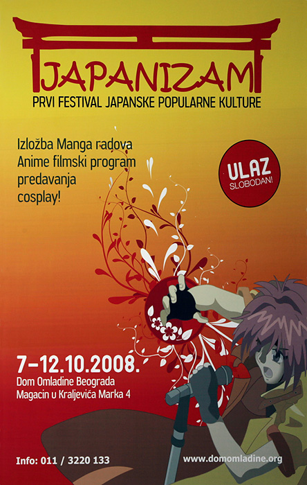 Japanska popularna kultura, Anime, Mange, J-pop, igrani filmovi ali, i klasična kultura, neobične discipline i običaji - sve to tema je prvog srpskog neformalnog festivala u potpunosti posvećenog Japanu. Centralni događaj festivala je izložba crteža domaćih Manga i Anime crtača koja će biti organizovana u Magacinu u Kraljevića Marka 4. Pored ove izložbe biće organizovane i filmske projekcije, predavanja, radionice, igraonice...