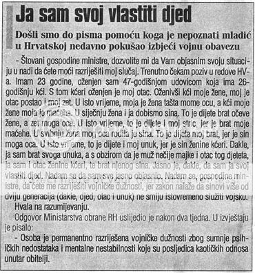 Oslobodjen zbog teske povrede desnog oka od strane MUPa, a naravno nikad ja ni ne bi bio oslobodjen da nisam otiso u taj medicinski centar i izmisljao gomilu stvari, naravno dovoljna je bila jedna da upali. Jer pas'te, da sam moro u vojsku ja bi izvrsio ritualno samoubuistvo na trgu, naravno jedan drugar i ja samo jos od '96 gurali taj "prigovor savesti", on je cak i pisao dosta toga, a uz Unison singlicu je isao i letak protiv vojne obaveze, on je kasnije izdo stvar i otiso u vojsku iako smo se izborili za prigovor, tj. civilnu sluzbu, posle je preso u Partiju Rada, jebo ga Staljin da ga jebo, svi znate na koga milsim jbga. :roll: